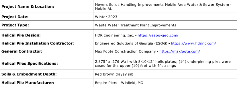 Engineered Solutions of Georgia (ESOG) Installs (39) Helical Piles for Improvements for the Meyers Solids Handling Improvements Mobile Area Water & Sewer System Mobile, AL