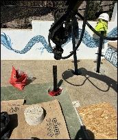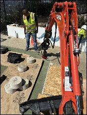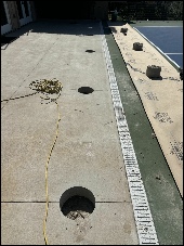 Accessing the slab required core drilling twenty-three 10-inch diameter holes. Concrete thickness varied significantly across the site, ranging from approximately 6 inches to more than 12 inches, and in some areas, excess overpour had to be chipped away before installation could proceed. Despite these inconsistencies, the team executed the installation plan with precision and care to protect the court surface.