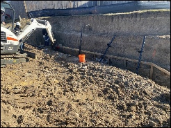 After the design process was completed, the General Contractor on the project started demolition of the existing 750 ft. retaining wall. Buried power lines and utility lines were uncovered right along the face of the proposed wall at the time of installation. Consequently, the installation angle of some of the tiebacks were revised accordingly to avoid these obstructions in the field. Ram Jack installed (110) vertical 2 7/8” New Construction piles at a depth of 30’, (56) 30-degree 2 7/8” Tie-Backs at 33’, (117) 45-degree 2 7/8” tiebacks at 25’. Ram Jack worked with the General Contractors' schedule to complete the project. During the installation, Ram Jack fought rainy conditions and still finished the project early and within budget.