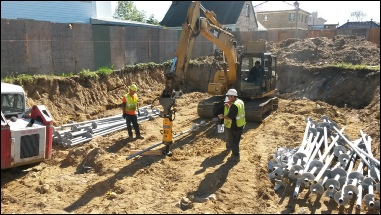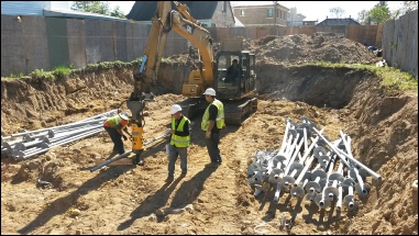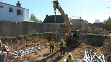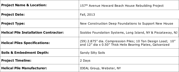 Super Storm Sandy badly damaged a house on 157th avenue in Howard Beach, NY. The house had to be demolished and a new house constructed. Scobbo Foundation Systems was contracted to install (59) helical piles as deep foundation support for the new house. Scobbo ordered helical piles that were 22 feet in length, so the piles could be installed to the termination depth without having to bolt on extensions. The piles were installed to a minimum of 5,000 ft. lbs. of torque. The project was successfully completed in two days.