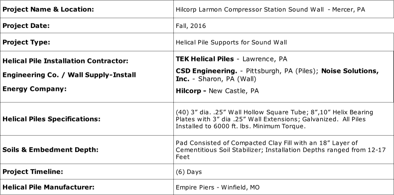 Noise Solutions contracted TEK to design/supply/ install (40) helical pile foundations to support their sound wall that enclosed Hilcorp’s existing compressors - (2) battered piles per column location. TEK also supplied and installed a W8x31 connection beam with base plate at each column location. All piles were pre-drilled due to the layer of cementitious soil stabilizer.