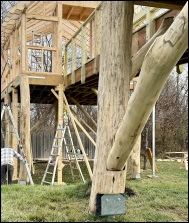 Once installation was complete and capacities were confirmed, The TreeHouse Guys LLC proceeded with construction of the superstructure. Custom timber elements and elevated supports were integrated directly onto the helical pier saddle brackets, resulting in a visually striking structure supported by a fully engineered foundation system.