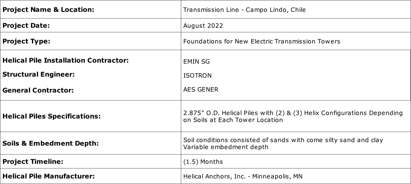 Helical Foundation Solutions Supplies (192) Helical Piles for a New Transmission Line with 220kv Capacity in Campo Lindo, Chile